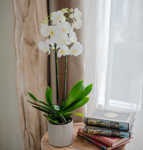 orchidee blanche et son pot ( le pot peut differer de la photo )